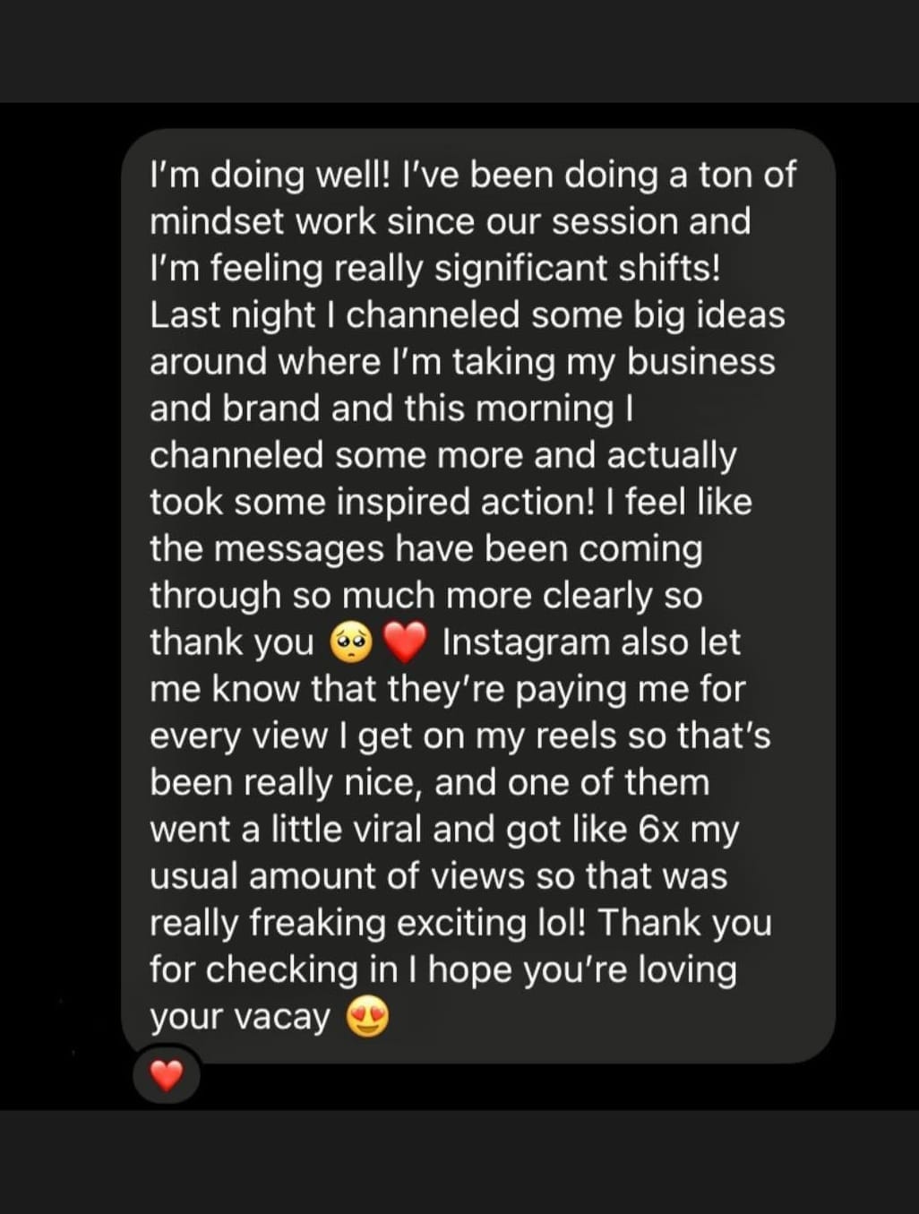 My clients have transformed their lives, businesses, bodies, and relationships. My clients have: Gotten pregnant after months of trying to conceive and after multiple miscarriages Cleared patterns that blocked their next massive income goal (over $100K months) Created courses and attracted clients Redirected and started new businesses Attracted their dream jobs and subsequent moves to new, exciting cities Established deeper trust in their partners Healed disordered eating habits Eliminated toxic relationships Experienced unbending clarity and confidence, and more My goal is to create a container for my clients to transform in seemingly impossible ways. This work is a gift, to me and to my clients. If you are ready to watch your life transform and grow, work with me.